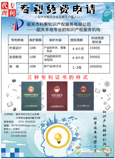 正文摘要:專利免費申請!!(僅對韶關企業(yè)和戶籍人口)韶關市科衡知識產權服務有限公司-----韶關本地專業(yè)的知識產權服務機構地址:韶關市武江區(qū)工業(yè)東路24號陽光康地A棟702房電話:0751-8536926聯(lián)系人:王工手 機 ... |